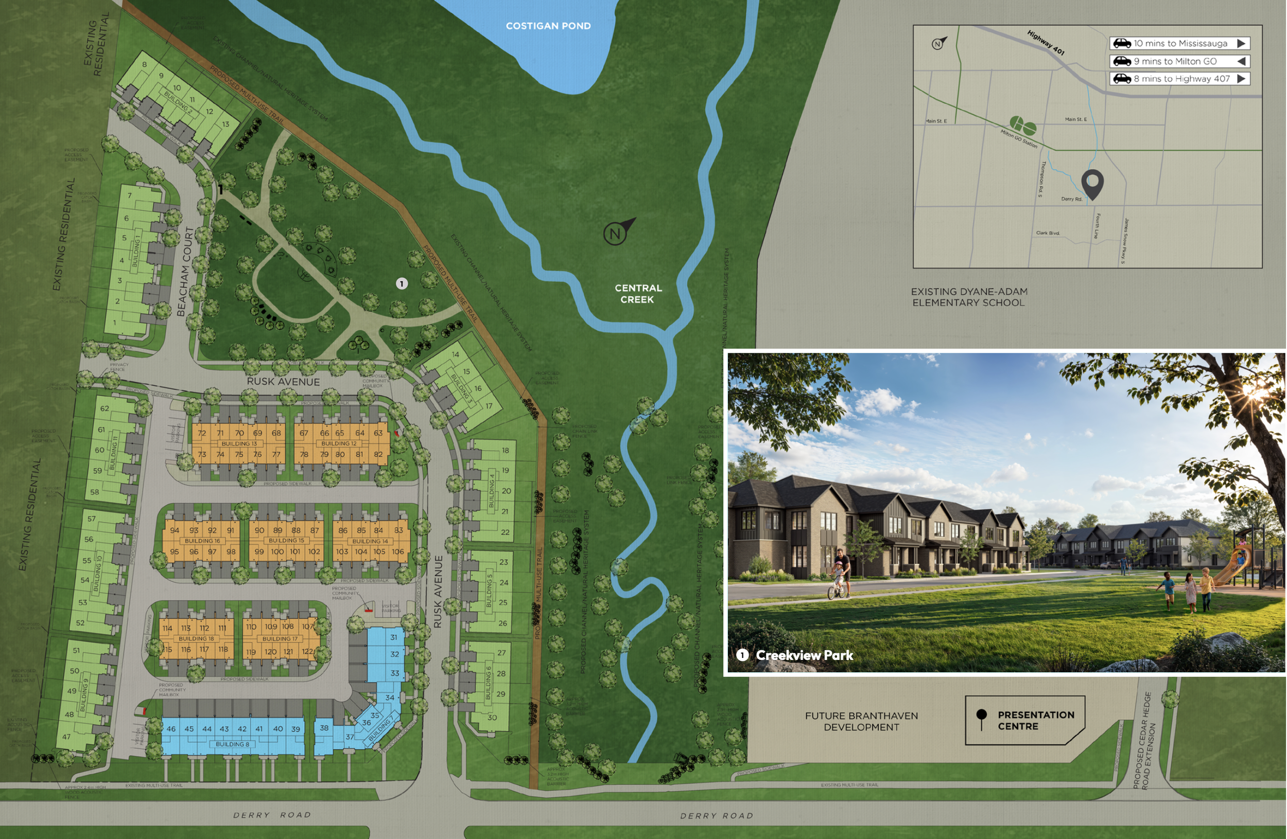 Creekview Collective residents will enjoy the established Clarke Community, one of Milton’s most family-focused settings, surrounded by abundant green spaces, sports fields, fitness centres, golf courses, and community hubs that keep life active and engaging. It’s a neighbourhood where safety, opportunity, and lifestyle align — a place designed for families to grow, connect, and thrive. Here, community doesn’t just exist; it flows through everyday life.